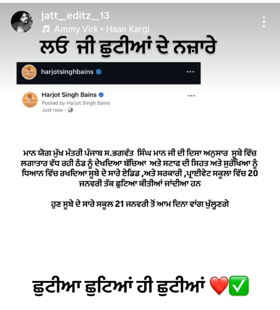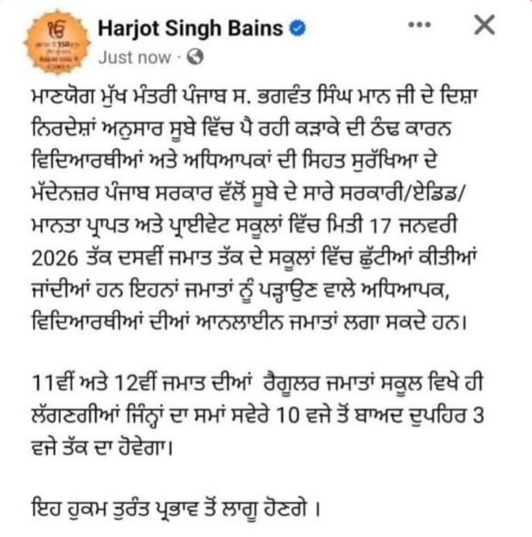इस माहौल में शिक्षा मंत्री हरजोत बैंस के नाम से सोशल मीडिया पर एक पोस्ट तेजी से वायरल हो गई, जिसमें 21 जनवरी तक स्कूलों की छुट्टियां बढ़ाने का दावा किया गया।