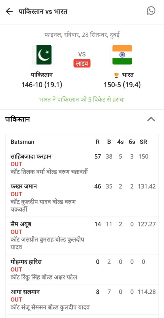 Asia Cup: में भारत की ऐतिहासिक जीत: पाकिस्तान को 5 विकेट से हराया, देशभर में जश्न का माहौल… देखें स्कोर कार्ड