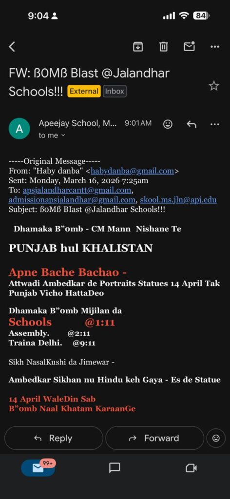 पंजाब हॉटमेल, जालंधर। शहर में सोमवार सुबह उस समय अफरा-तफरी मच गई जब 6 नामी स्कूलों, दिल्ली जाने वाली ट्रेन, पंजाब असेंबली और डॉ. भीमराव अंबेडकर की मूर्तियों को बम से उड़ाने की धमकी भरी दो ईमेल सामने आईं।