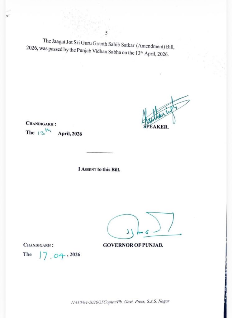पंजाब हॉटमेल, चंडीगढ़/जालंधर। पंजाब के राज्यपाल Gulab Chand Kataria ने जागत ज्योति श्री गुरु ग्रंथ साहिब सत्कार (संशोधन) विधेयक-2026 को मंजूरी दे दी है।