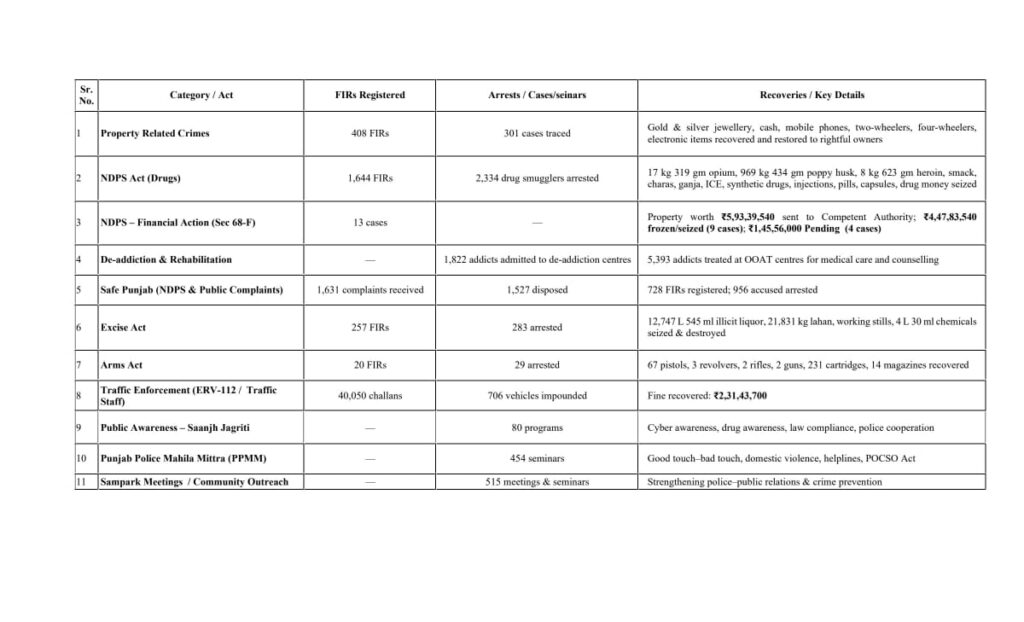 इसके अतिरिक्त, एनडीपीएस और जन शिकायतों से संबंधित सेफ पंजाब पहल के तहत 1,631 शिकायतें प्राप्त हुईं, जिनमें से 1,527 एफआईआर दर्ज की गईं। 956 आरोपियों को गिरफ्तार किया गया, जिससे प्रभावी शिकायत निवारण और जवाबदेही सुनिश्चित हुई।