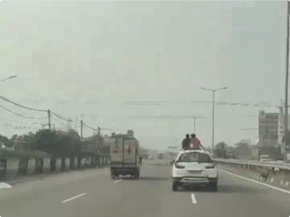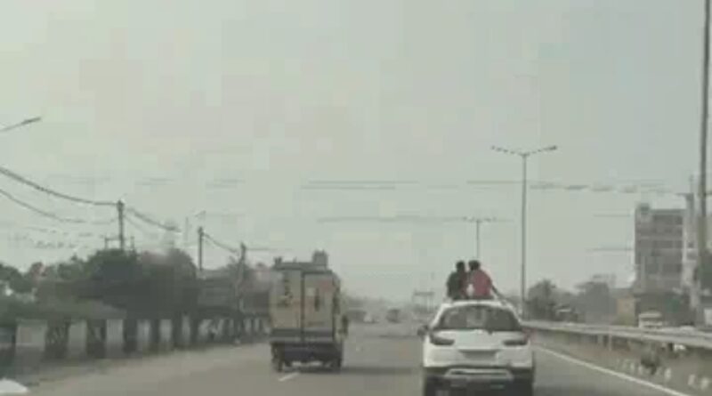 पंजाब हॉटमेल, जालंधर। जालंधर-लुधियाना नेशनल हाईवे पर एक खतरनाक नजारा देखने को मिला, जब दौड़ती हुई कार के सनरूफ से बच्चे बाहर निकलकर स्टंट करते नजर आए। कार की रफ्तार करीब 70 किलोमीटर प्रति घंटा थी और बच्चे लगभग 15 किलोमीटर तक इसी तरह बाहर निकले रहे।
