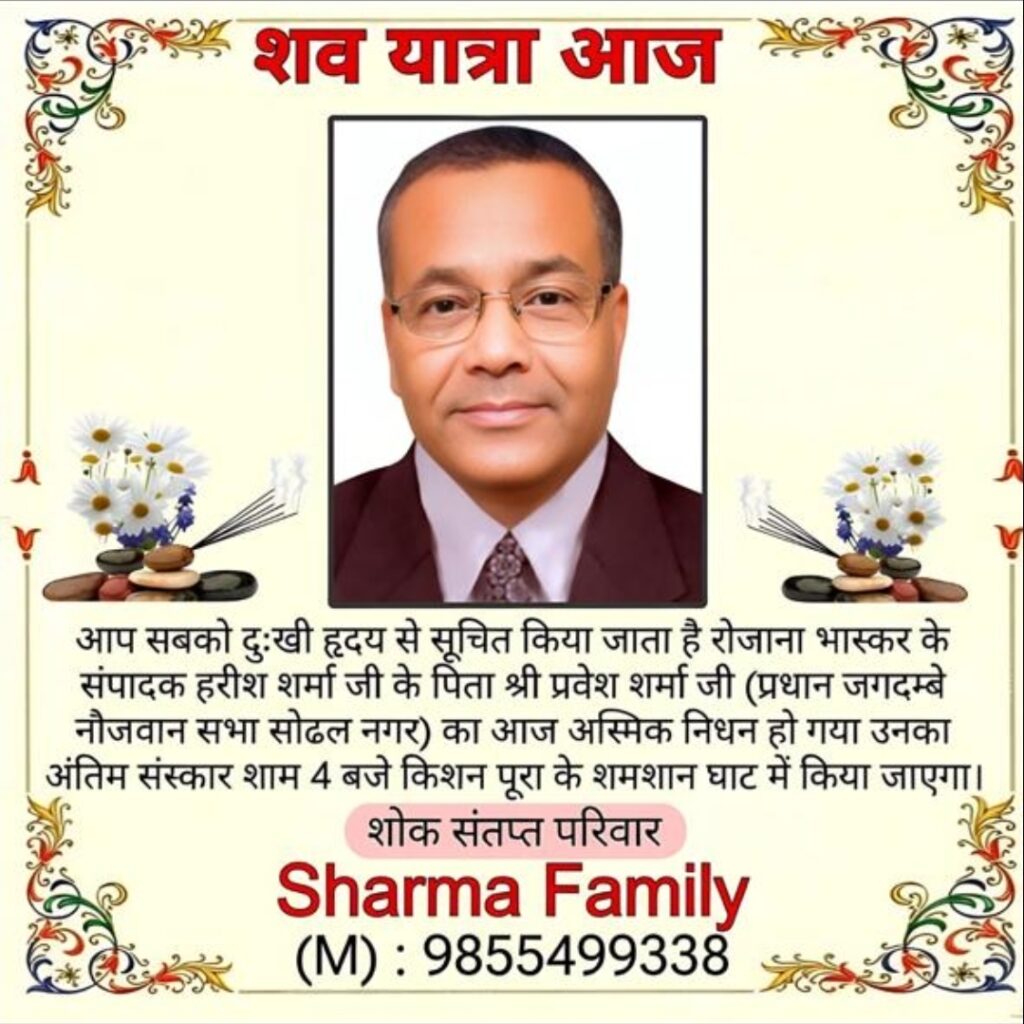 हरीश शर्मा, जो ‘रोजाना भास्कर’ नाम से अपना वेब चैनल संचालित करते हैं, के पिता के निधन पर शहर की राजनीतिक, सामाजिक, धार्मिक और मीडिया संस्थाओं के प्रतिनिधियों ने गहरा दुख व्यक्त किया है और परिवार के प्रति संवेदनाएं प्रकट की हैं।