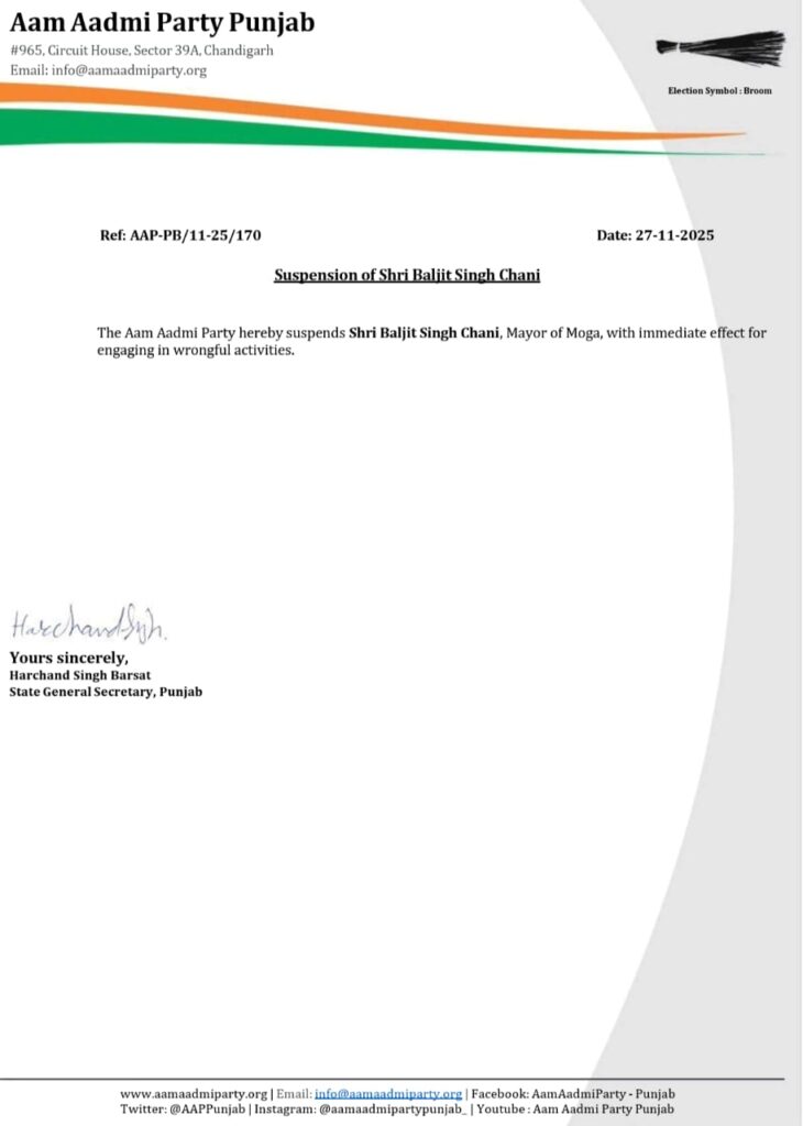 इस कदम को AAP ने अपनी “जीरो टॉलरेंस नीति” का हिस्सा बताया है।बलजीत सिंह चानी को 21 अगस्त 2023 को मोगा नगर निगम का मेयर निर्विरोध चुना गया था। वे पंजाब में AAP के पहले मेयर बने थे।