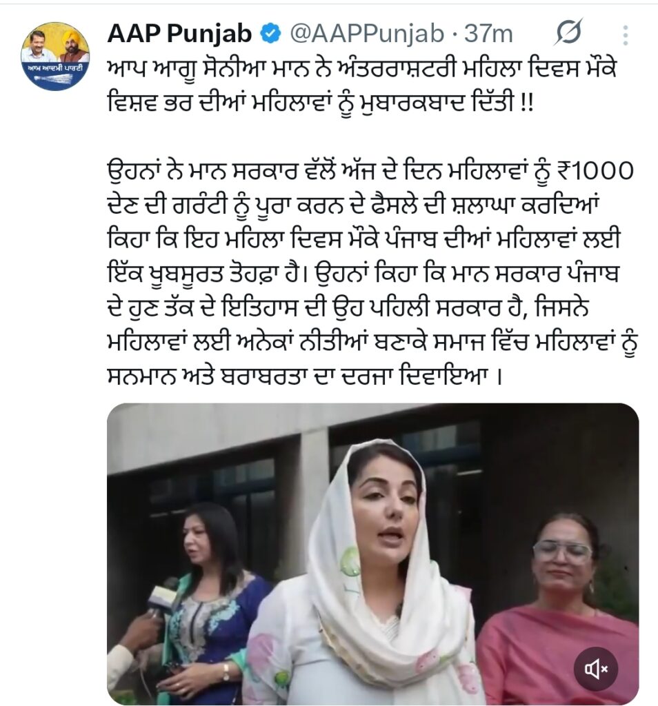 सोनिया मान ने मानी सरकार द्वारा महिलाओं को ₹1000 प्रति माह देने की गारंटी पूरी करने के फैसले की सराहना करते हुए कहा कि यह पंजाब की महिलाओं के लिए महिला दिवस पर एक खूबसूरत और ऐतिहासिक तोहफा है।