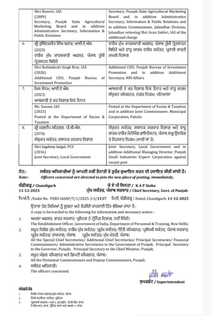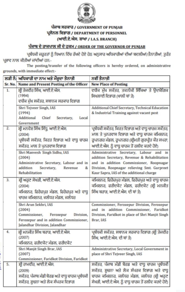 कई जिलों में बदली ज़िम्मेदारियां: पंजाब सरकार का बड़ा प्रशासनिक फेरबदल किया, 7 IAS और 1 PCS अधिकारी का तबादला