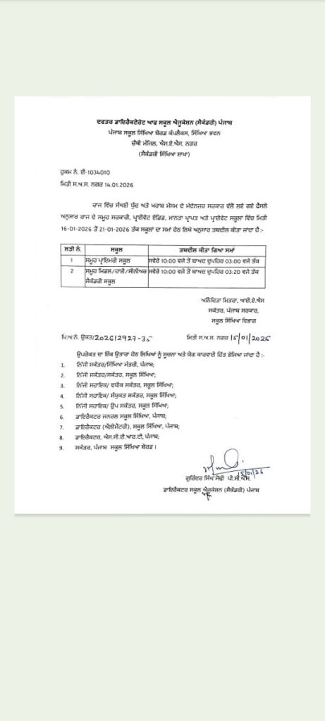 पंजाब हॉटमेल, जालंधर/चंडीगढ़। पंजाब में बढ़ती ठंड और शीत लहर को देखते हुए शिक्षा विभाग ने स्कूलों के समय में बदलाव किया है। नए निर्देशों के अनुसार प्राइमरी स्कूल सुबह 10 बजे से दोपहर 3 बजे तक खुलेंगे, जबकि मिडल, हाई और सीनियर सेकेंडरी स्कूल सुबह 10 बजे से 3:20 बजे तक संचालित किए जाएंगे।