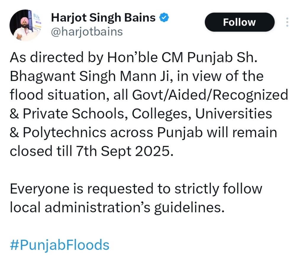 पंजाब हॉटमेल, जालंधर/चंडीगढ़। पंजाब में लगातार बारिश और बाढ़ की गंभीर स्थिति को देखते हुए राज्य सरकार ने पूरे प्रदेश को आपदा प्रभावित राज्य घोषित कर दिया है।