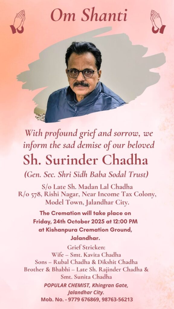 पंजाब हॉटमेल, जालंधर। जालंधर में गहरा शोक का माहौल है। समाजसेवा और धार्मिक कार्यों में अग्रणी रहे श्री सुरिंदर चड्ढा, जो श्री सिद्ध बाबा सोडल ट्रस्ट के जनरल सेक्रेटरी थे, अब हमारे बीच नहीं रहे।