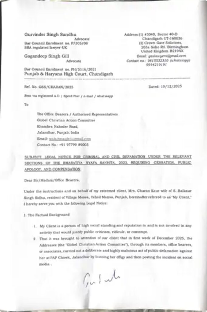 पंजाब हॉटमेल, जालंधर। सिद्धू मूसेवाला की मां चरण कौर का पुतला जलाने के मामले में नया विवाद खड़ा हो गया है। चरण कौर ने अपने वकील के जरिए क्रिश्चियन ग्लोबल एक्शन कमेटी को 10 लाख रुपए का लीगल नोटिस भेजा है। नोटिस में पूछा गया है कि आखिर किसके इशारे पर उनका पुतला लाया और जलाने की कोशिश की गई।