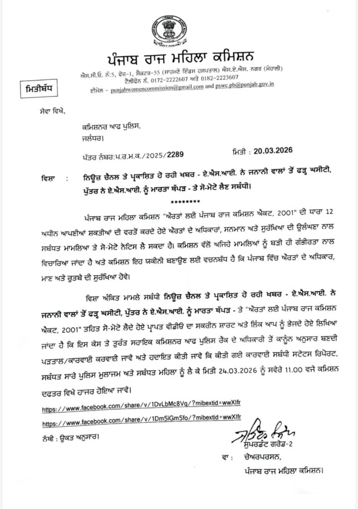 मामले की गंभीरता को देखते हुए पंजाब राज्य महिला आयोग ने तुरंत संज्ञान लिया है। आयोग ने जालंधर की पुलिस कमिश्नर धनप्रीत कौर को निष्पक्ष जांच के निर्देश दिए हैं। आयोग ने संबंधित अधिकारियों को 24 मार्च 2026 को चंडीगढ़ कार्यालय में सभी दस्तावेजों और तथ्यों सहित उपस्थित होने को कहा है।