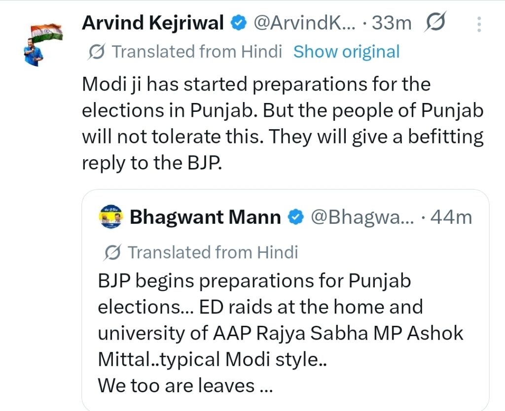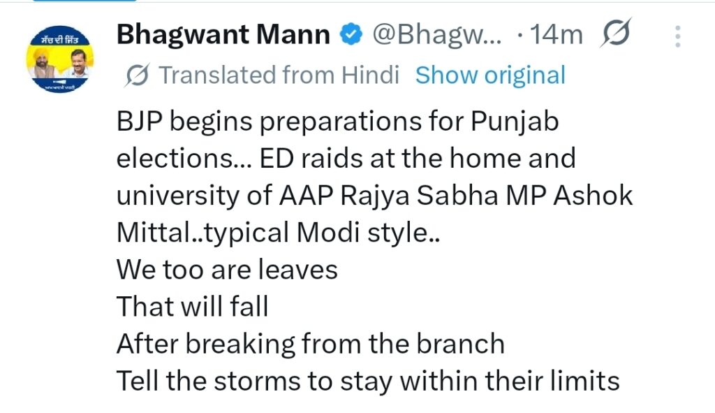 सीएम मान ने बयान जारी करते हुए कहा कि यह कार्रवाई “चुनाव की तैयारी” का हिस्सा है और इसे उन्होंने “टिपिकल मोदी स्टाइल” करार दिया। उन्होंने आरोप लगाया कि केंद्रीय एजेंसियों का इस्तेमाल राजनीतिक विरोधियों को दबाने और चुनाव से पहले माहौल बनाने के लिए किया जा रहा है।