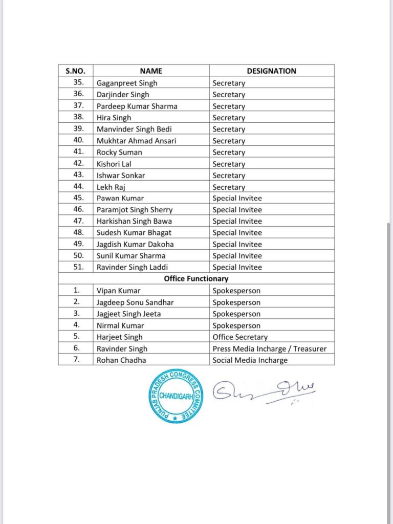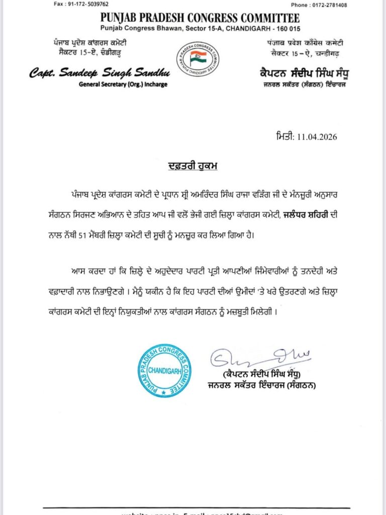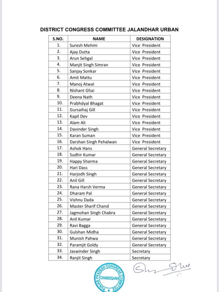 पंजाब हॉटमेल, जालंधर (मनमोहन सिंह)। Indian National Congress की पंजाब इकाई में उस समय हलचल मच गई जब प्रदेश प्रधान Amrinder Singh Raja Warring द्वारा जालंधर जिला कांग्रेस शहरी के 51 पदाधिकारियों की सूची जारी की गई।